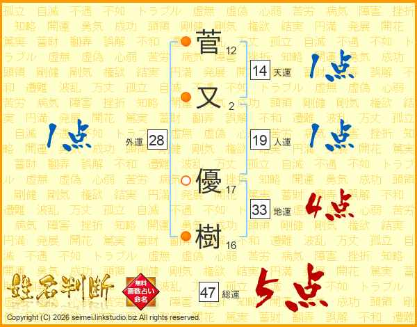 生活面を象徴する運勢です。外部から受ける影響力を表し、結婚運、家庭運や職場、環境への順応性を表します。総運から人運を引いた画数。姓や名が1文字の場合を除く。