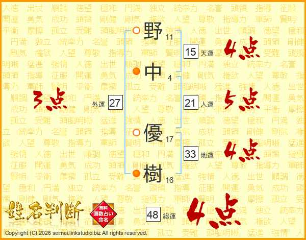 野(11画)中(4画) 優(17画)樹(16画)