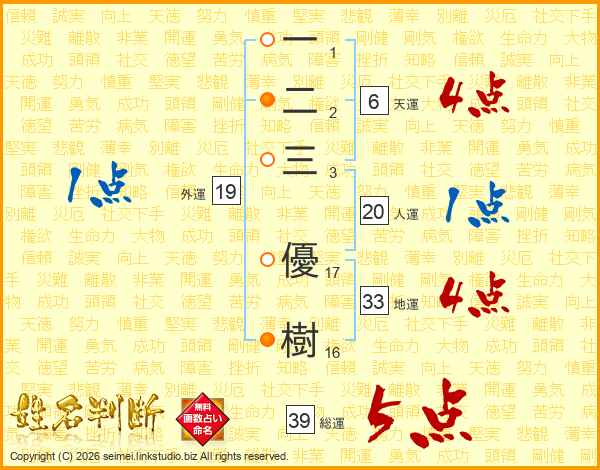 一(1画)二(2画)三(3画) 優(17画)樹(16画)