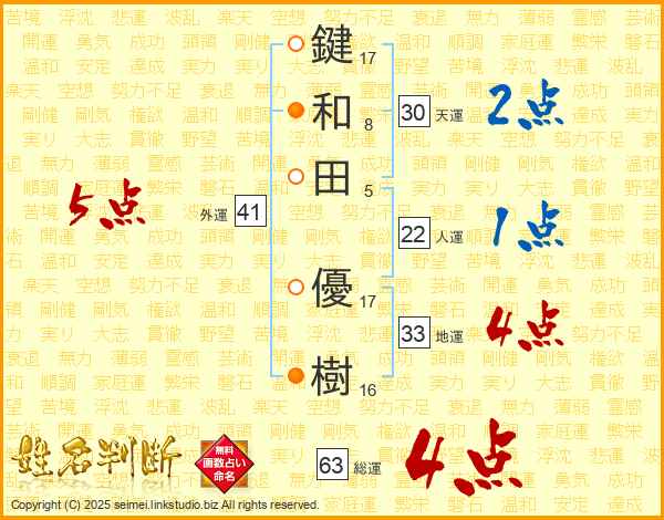 鍵(17画)和(8画)田(5画) 優(17画)樹(16画)