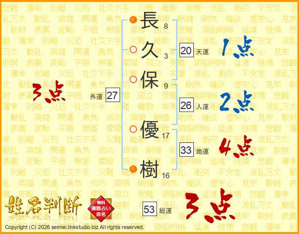 長(8画)久(3画)保(9画) 優(17画)樹(16画)