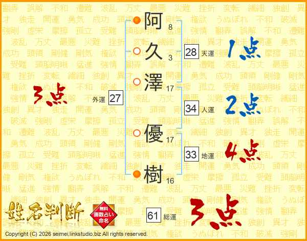 阿(8画)久(3画)澤(17画) 優(17画)樹(16画)