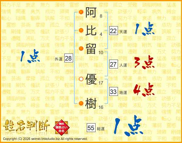 阿(8画)比(4画)留(10画) 優(17画)樹(16画)