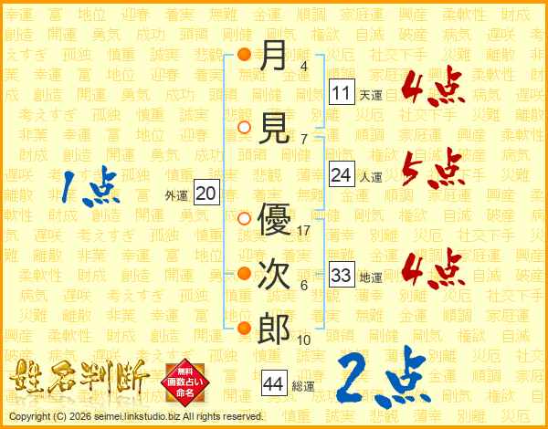 月(4画)見(7画) 優(17画)次(6画)郎(10画)
