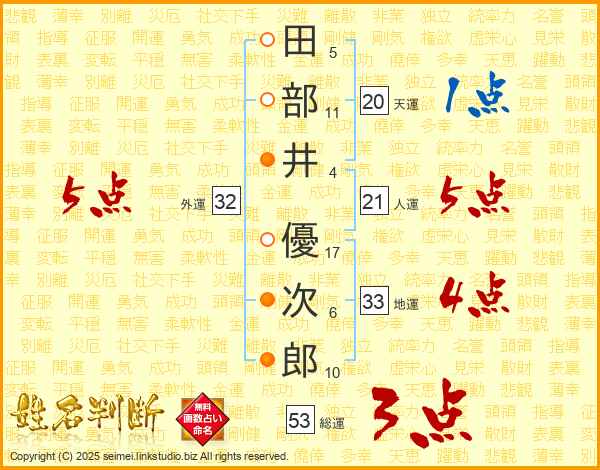 田(5画)部(11画)井(4画) 優(17画)次(6画)郎(10画)