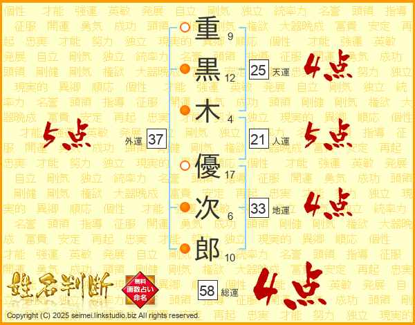 重(9画)黒(12画)木(4画) 優(17画)次(6画)郎(10画)