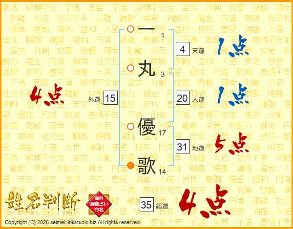 生活面を象徴する運勢です。外部から受ける影響力を表し、結婚運、家庭運や職場、環境への順応性を表します。総運から人運を引いた画数。姓や名が1文字の場合を除く。
