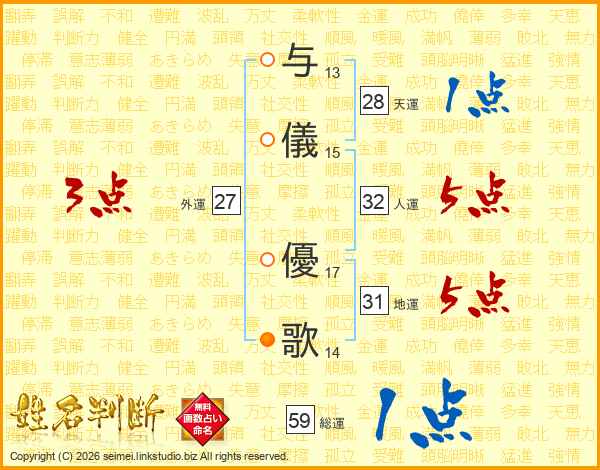 与儀優歌さんの総運は59画の1点!