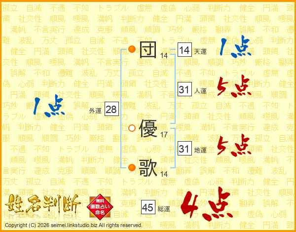 団(14画) 優(17画)歌(14画)