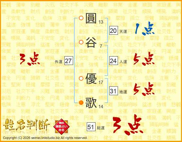 圓(13画)谷(7画) 優(17画)歌(14画)
