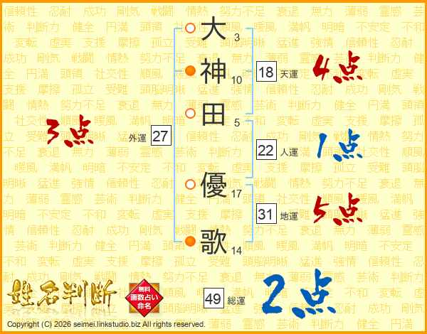 大(3画)神(10画)田(5画) 優(17画)歌(14画)