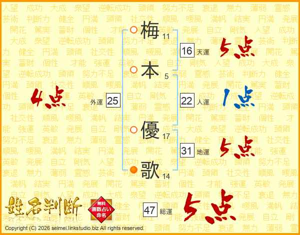 梅(11画)本(5画) 優(17画)歌(14画)