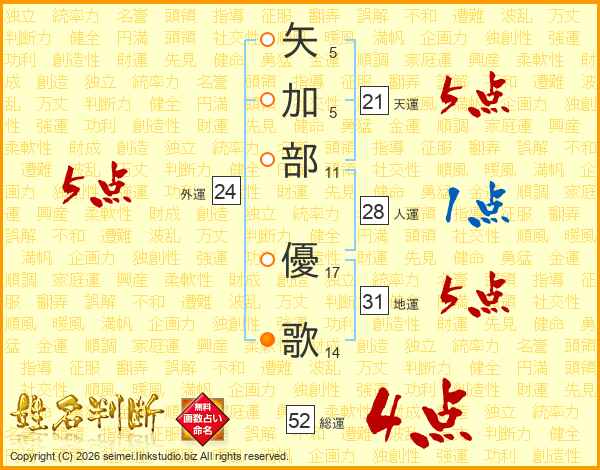 矢(5画)加(5画)部(11画) 優(17画)歌(14画)