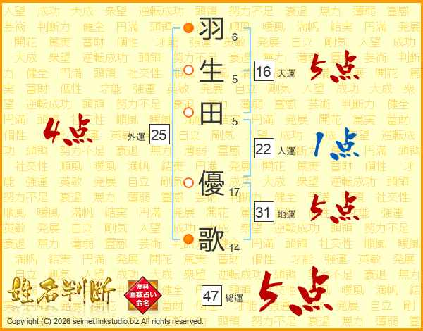 羽(6画)生(5画)田(5画) 優(17画)歌(14画)