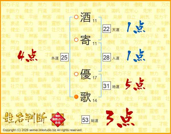 酒(11画)寄(11画) 優(17画)歌(14画)