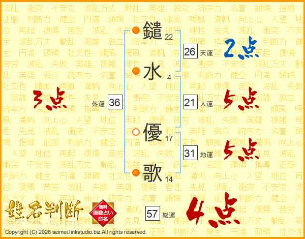 鑓(22画)水(4画) 優(17画)歌(14画)