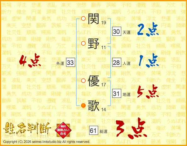 生活面を象徴する運勢です。外部から受ける影響力を表し、結婚運、家庭運や職場、環境への順応性を表します。総運から人運を引いた画数。姓や名が1文字の場合を除く。