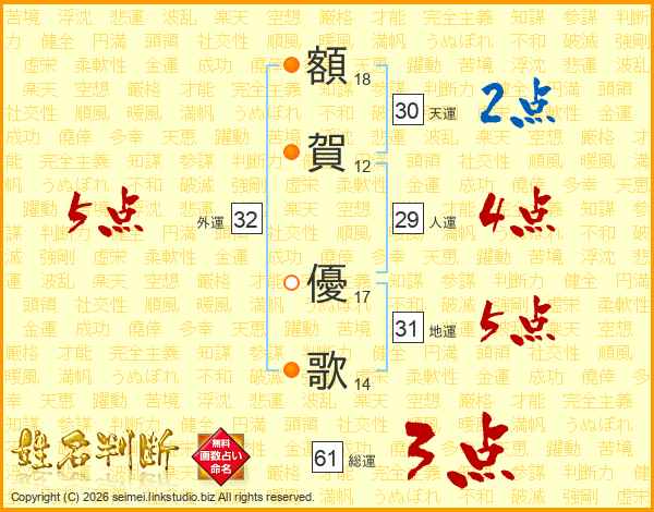 額(18画)賀(12画) 優(17画)歌(14画)