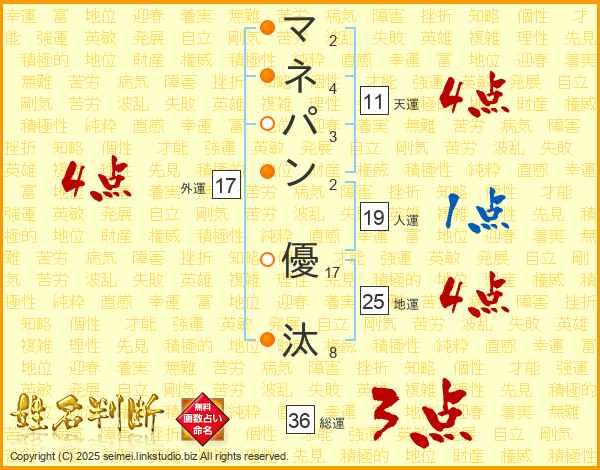 マ(2画)ネ(4画)パ(3画)ン(2画) 優(17画)汰(8画)
