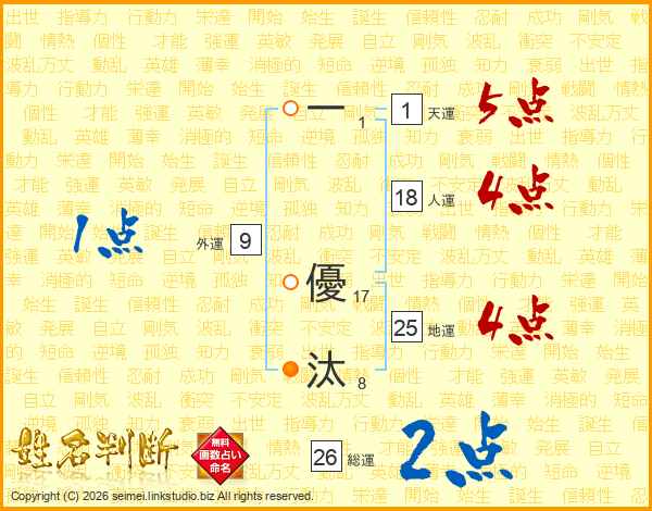 生活面を象徴する運勢です。外部から受ける影響力を表し、結婚運、家庭運や職場、環境への順応性を表します。総運から人運を引いた画数。姓や名が1文字の場合を除く。