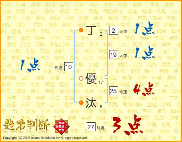生活面を象徴する運勢です。外部から受ける影響力を表し、結婚運、家庭運や職場、環境への順応性を表します。総運から人運を引いた画数。姓や名が1文字の場合を除く。