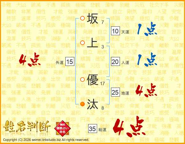 坂(7画)上(3画) 優(17画)汰(8画)