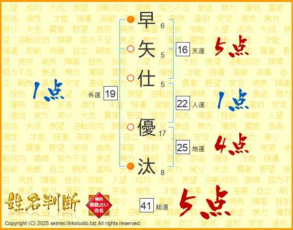 早(6画)矢(5画)仕(5画) 優(17画)汰(8画)