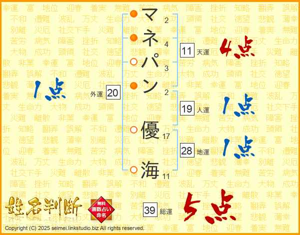 マ(2画)ネ(4画)パ(3画)ン(2画) 優(17画)海(11画)
