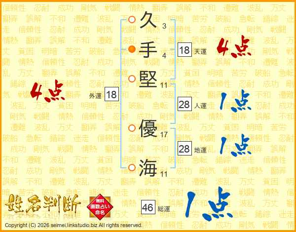 久(3画)手(4画)堅(11画) 優(17画)海(11画)