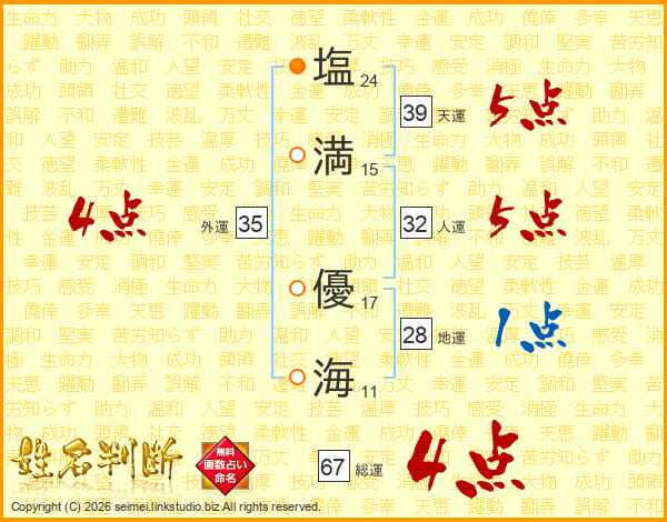 塩(24画)満(15画) 優(17画)海(11画)