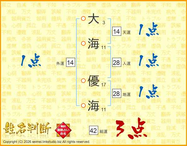 生活面を象徴する運勢です。外部から受ける影響力を表し、結婚運、家庭運や職場、環境への順応性を表します。総運から人運を引いた画数。姓や名が1文字の場合を除く。