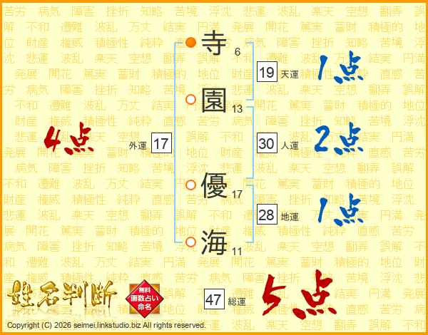 寺(6画)園(13画) 優(17画)海(11画)