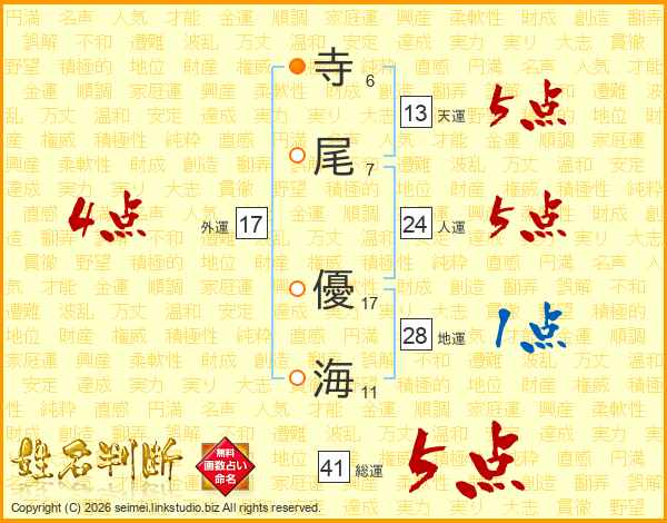 寺(6画)尾(7画) 優(17画)海(11画)