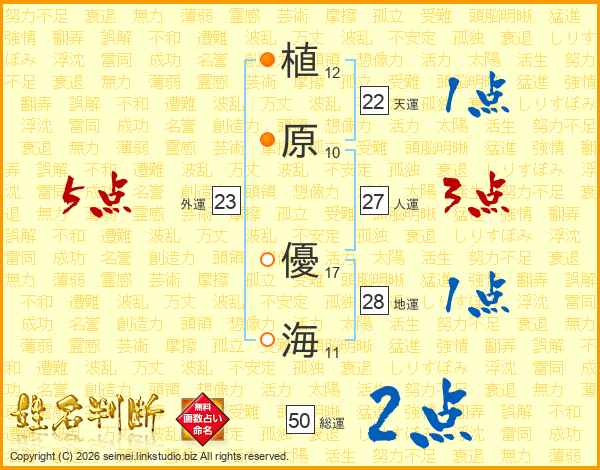 植(12画)原(10画) 優(17画)海(11画)
