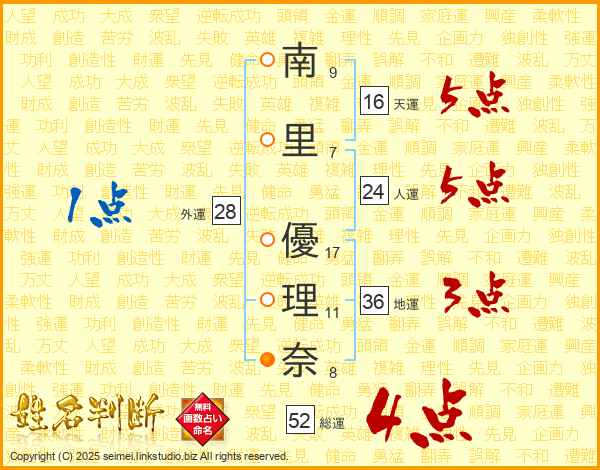 南里優理奈さんの人運は24画の5点!