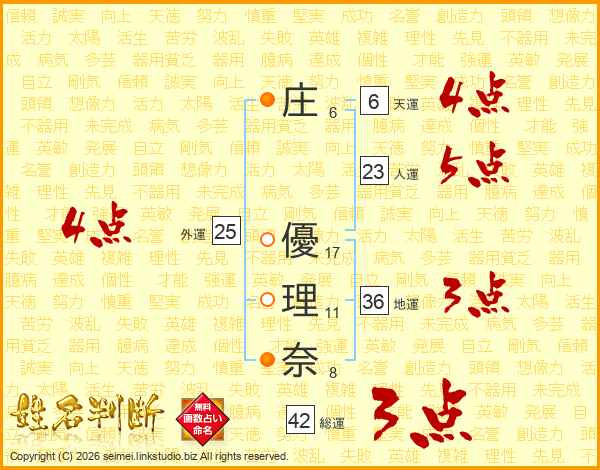 庄(6画) 優(17画)理(11画)奈(8画)