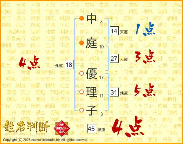 中(4画)庭(10画) 優(17画)理(11画)子(3画)
