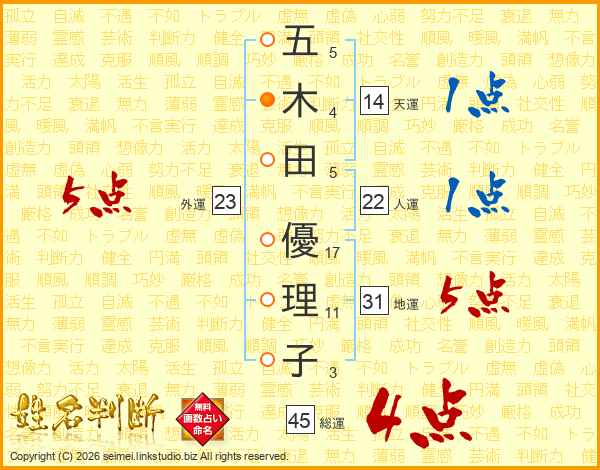 五木田優理子さんの総運は45画の4点!