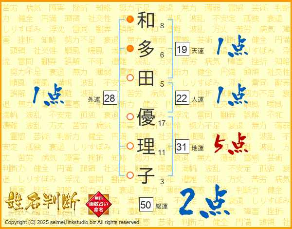 和(8画)多(6画)田(5画) 優(17画)理(11画)子(3画)