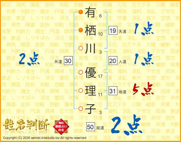 有栖川優理子さんの総運は50画の2点!
