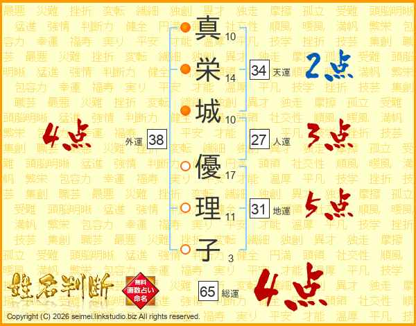 真(10画)栄(14画)城(10画) 優(17画)理(11画)子(3画)