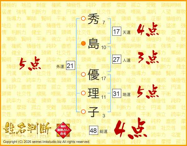 秀(7画)島(10画) 優(17画)理(11画)子(3画)