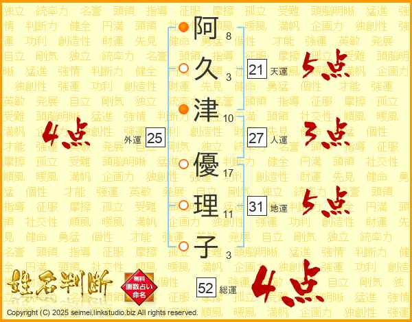 阿(8画)久(3画)津(10画) 優(17画)理(11画)子(3画)