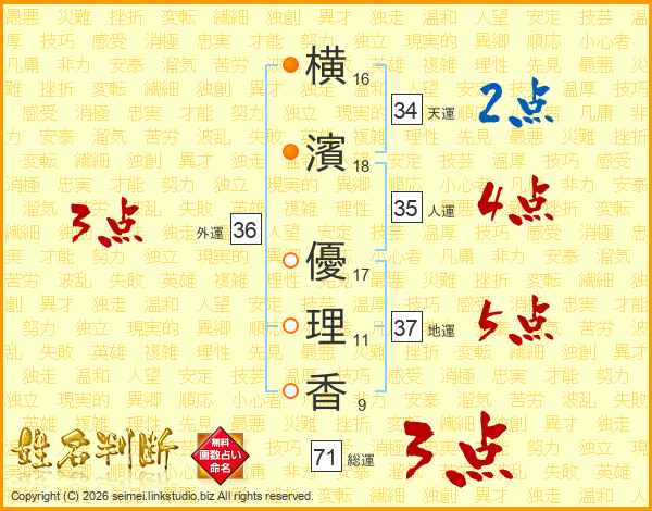 横(16画)濱(18画) 優(17画)理(11画)香(9画)