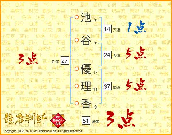 池(7画)谷(7画) 優(17画)理(11画)香(9画)