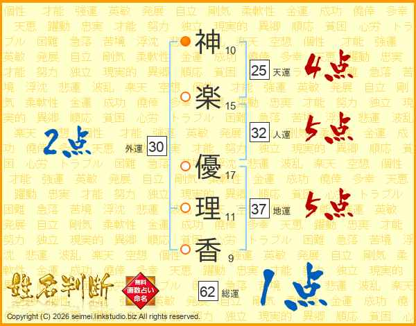 神(10画)楽(15画) 優(17画)理(11画)香(9画)