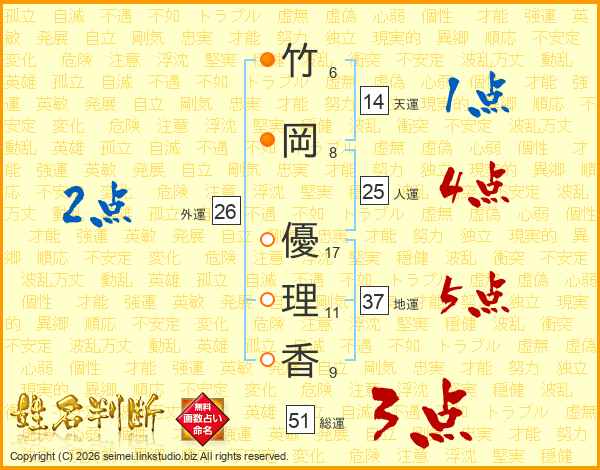 竹(6画)岡(8画) 優(17画)理(11画)香(9画)