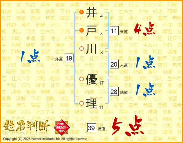 井(4画)戸(4画)川(3画) 優(17画)理(11画)