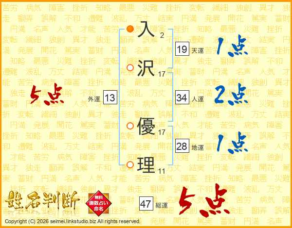 生活面を象徴する運勢です。外部から受ける影響力を表し、結婚運、家庭運や職場、環境への順応性を表します。総運から人運を引いた画数。姓や名が1文字の場合を除く。