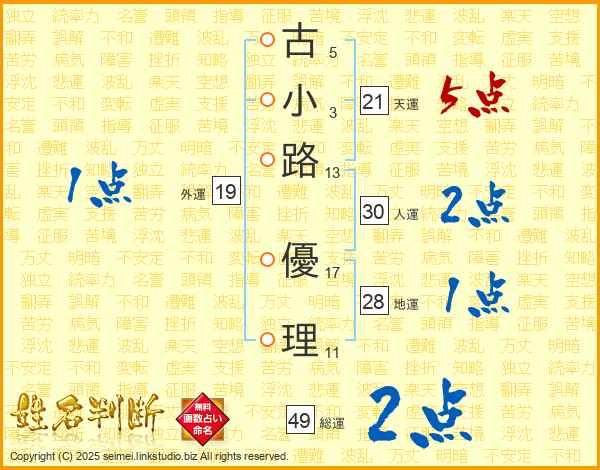 古(5画)小(3画)路(13画) 優(17画)理(11画)